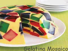 PROCEDIMIENTO 1.-Prepare las gelatinas una por una con una taza menos de agua de lo que indica el paquete 2.-Vacie en cuatro moldes cuadros extendidos y deje que cuaje completamente 3.-Corte las gelatinas en cubitos y reserve 4.-Aparete, ponga al fuego la leche condensada con el agua. Cuando este caliente, retire del fuego. 5.-Incorpore la grenetina disuelta en el agua fria y la vainilla. Mezcle bien y deje enfiar completemente 6.-Mezcle los cubitos de gelatina de sabores y vacie a un molde, añada la gelatina de leche 7.-Refrigere hasta que cuaje 8.-Desmolde y decore a su gusto